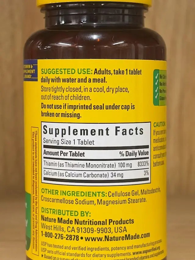 Amount Per Serving: Vitamin B1 100 mg, Calcium 34mg