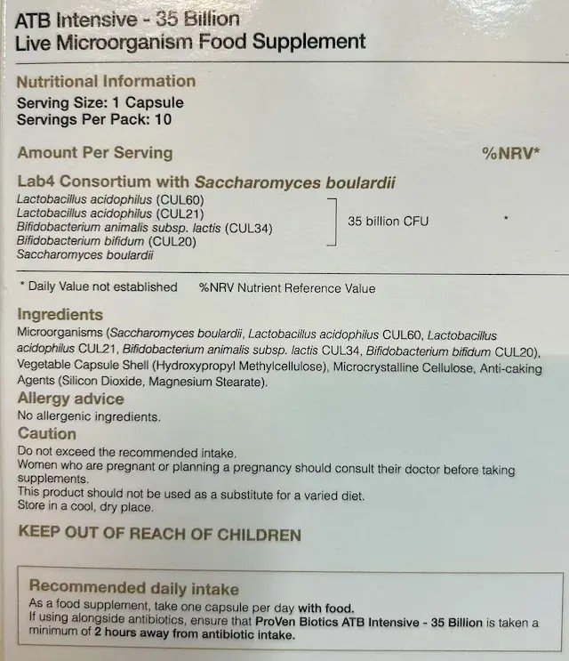If using alongside antibiotics, ensure that ProVen Biotics ATB Intensive – 35 Billion is taken a minimum of 2 hours away from antibiotic intake.