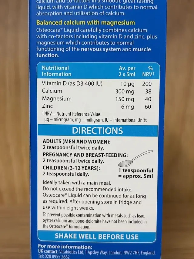 Ideally taken with a main meal. Do not exceed the recommended intake. Osteocare® Liquid can be continued for as long as required. After opening store in fridge and use within eight weeks. To prevent possible contamination with metals such as lead, oyster calcium and bone-dolomite have not been included in the Osteocare® formulation.